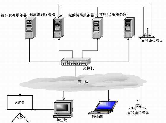 當老師端在異地時(攝像頭離服務器較遠,無法物理連接),可通過“電視會議系統(tǒng)”將老師的圖像及聲音實時傳送到編碼服務器,桌面課件可以通過PcAnywhere傳送到編碼服務器。圖像,聲音和桌面課件通過Web Streaming采集壓縮并在網(wǎng)上實時廣播。這種系統(tǒng)架構也是當今功能比較齊全和完善的一種實現(xiàn)方式。