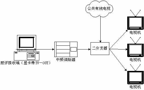 本系統(tǒng)接收端接收實時廣播時,除了用普通PC機收看,或把PC機接收到的信號輸?shù)诫娨暎ù笃粒┥鲜湛,甚至還可以接入有線電視網(wǎng)進行播放。具體方法是通過一個接收端接收股評節(jié)目,通過帶TV-OUT的顯卡把TV信號輸出到中頻調(diào)制設備,中頻調(diào)制設備可以把基帶模擬信號轉換成一個有線電視信號,且傳輸距離遠,損失小,再把這個信號與有線電視信號一起接入一個二分支器(2進1出),這就可以和公共有線電視共存,形成自己的頻道,供電視接收。