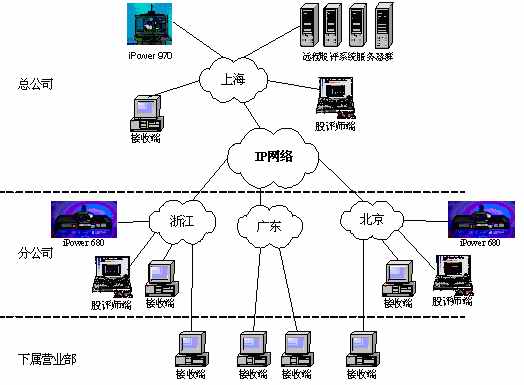 某證券公司有三級網(wǎng)絡,總公司、分公司和下屬營業(yè)部?偣镜椒止編捠2M,在總公司配置一套會議室型電視會議終端POLYCOM 970和一套多點會議服務器Radvision ViaIP400。在分公司配置了38套會議室型電視會議終端POLYCOM 680,用于與總公司進行雙向視頻會議。分公司到營業(yè)部帶寬是512K,各營業(yè)部安裝遠程股評系統(tǒng)接收端程序,遠程股評系統(tǒng)服務器都放置在海通總公司。當在總公司進行股評時,總公司本地攝像頭拍攝教師畫面,MIC采集教師聲音,傳給服務器編碼,再通過網(wǎng)絡供各個接收端接收;當在分公司進行股評時,首先分公司的電視會議設備采集教師畫面及聲音傳回總公司的電視會議設備,再傳給遠程股評系統(tǒng)的服務器進行編碼,然后通過網(wǎng)絡發(fā)布,供接收端接收。(結構如下圖)