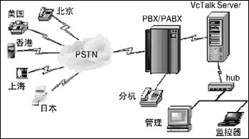 用語(yǔ)音板卡搭建電話會(huì)議一般注重在單一的音頻通信?紤]到單純的音頻或視頻會(huì)議模式都或多或少有各自的局限性,宇音將數(shù)據(jù)與語(yǔ)音整合在一起,實(shí)現(xiàn)音頻/圖文會(huì)議。VCTalk各系列電話會(huì)議系統(tǒng)采用高性能的語(yǔ)音/會(huì)議資源卡作為硬件支持,可實(shí)現(xiàn)多方電話會(huì)議(≥8),具有多組會(huì)議、與會(huì)者身份認(rèn)證、設(shè)置會(huì)議主持人、邀請(qǐng)與會(huì)者、會(huì)議通知、會(huì)議內(nèi)容同步播放、會(huì)議密碼保護(hù)、智能播放、會(huì)議內(nèi)容全程錄音/存儲(chǔ)、本地/遠(yuǎn)程查聽(tīng)會(huì)議錄音的功能,并可以對(duì)企業(yè)內(nèi)部發(fā)生的呼叫記錄進(jìn)行計(jì)費(fèi)和統(tǒng)計(jì)。針對(duì)中小企業(yè)辦公靈活的特點(diǎn),VCTalk系統(tǒng)搭建簡(jiǎn)單易行,其結(jié)構(gòu)圖見(jiàn)圖1。