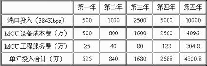 中國網(wǎng)通CNC視訊運營網(wǎng)絡(luò)在建網(wǎng)成本上主要考慮四個部分。一是視訊交換平臺MCU部分,主要用于多點視頻通信;二是視訊運營支撐系統(tǒng),包括各種運營所必須的軟件(網(wǎng)管、業(yè)務(wù)受理中心、業(yè)務(wù)管理中心)及相應(yīng)的硬件服務(wù)器;三是 H.323 視訊系統(tǒng)的關(guān)鍵組件GK軟件及相應(yīng)硬件服務(wù)器,其容量和個人視頻通信業(yè)務(wù)的發(fā)展情況息息相關(guān);四是投入資金利息。具體可細(xì)分如下: