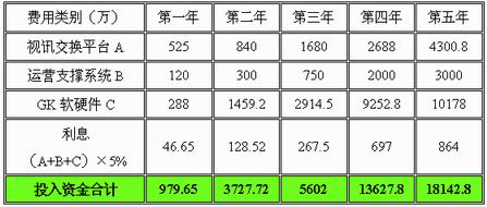 綜合上面三部分成本構(gòu)成,得出從系統(tǒng)建設(shè)并開始運營的頭五年中,各個年份建網(wǎng)資金投入和總投入: