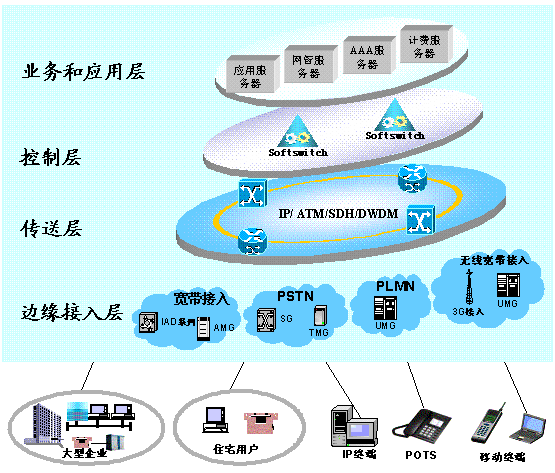 d)邊緣接入層:由各類媒體網(wǎng)關(guān)和綜合接入設(shè)備(IAD)組成,通過(guò)各種接入手段將各類用戶連接至網(wǎng)絡(luò),并將信息格式轉(zhuǎn)換成為能夠在分組網(wǎng)絡(luò)上傳遞的信息格式。