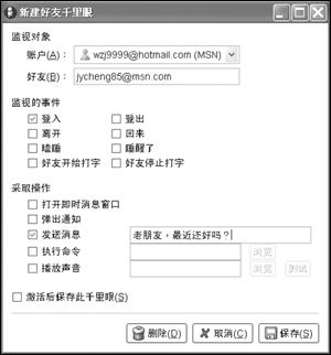 MSN可以在好友登錄時(shí)設(shè)置提示,但卻無(wú)法像QQ一樣自動(dòng)發(fā)出特定問(wèn)候,這未免有些遺憾。在Gaim中,我們可以為那些暫時(shí)不在線的好友添加千里眼監(jiān)視功能(如圖3),這里可以監(jiān)視的事件包括登入、登出、離開、回來(lái)、瞌睡、睡醒了、好友開始打字、好友停止打字等等,而可以設(shè)置的提示方式是打開即時(shí)消息窗口、彈出通知、發(fā)送消息、執(zhí)行命令、播放聲音等等,非常豐富!