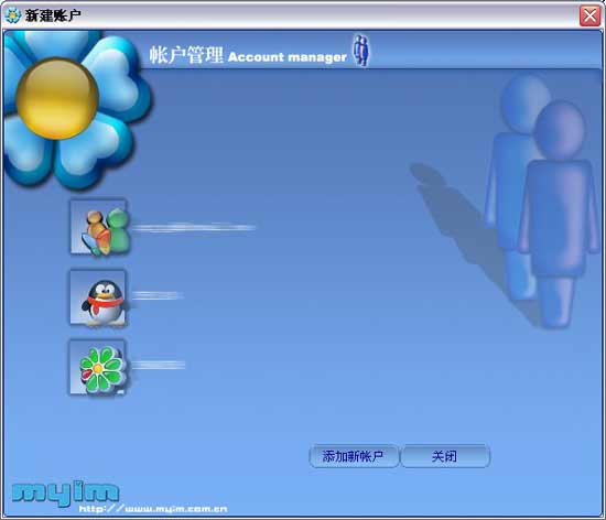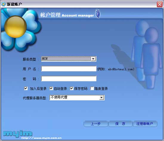 先添加相應(yīng)的賬戶;點(diǎn)擊"添加新賬戶"按鈕,彈出"賬戶管理"頁面,在"服務(wù)類型"的下拉列表中選擇相應(yīng)的服務(wù)類型,再依次輸入用戶名和密碼;設(shè)定完成后點(diǎn)擊"保存"即完成新賬戶的添加;保存完畢后myim自動返回登錄界面。