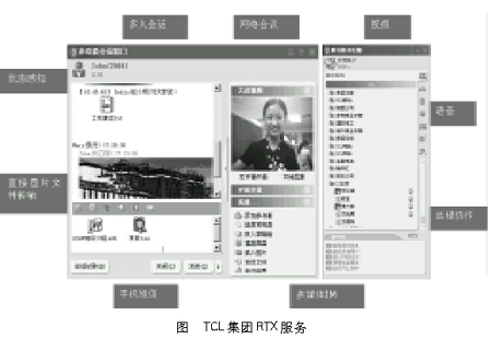 RTX產(chǎn)品支持標(biāo)準(zhǔn)的SIP、H.323 IP電話協(xié)議,并采用高質(zhì)量的QoS技術(shù)保證實時通信網(wǎng)絡(luò)質(zhì)量,使得TCL集團公司的用戶可以與同事之間采用語音或者視頻的面對面的交流(如圖),相當(dāng)于給集團公司的任何一位RTX用戶配備了一部集成的視頻和語音電話。目前這項服務(wù)在集團公司非常受歡迎,尤其是遠(yuǎn)程的代表處和集團總部之間的信息交流更直接、更快捷,在一定程度上取代了電話的功能,大大節(jié)約了通信費用。比如,TCL空調(diào)的計劃部每天需要和全國20多個代表處的計劃處進行數(shù)據(jù)往來,以前需要電話完成的功能現(xiàn)在通過RTX的即時文字、短信和語音對講完成,大大提高效率,節(jié)省了通信成本。
