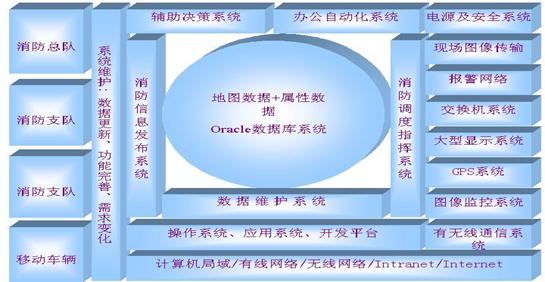 支撐平臺有計算機(jī)網(wǎng)絡(luò)系統(tǒng)、監(jiān)控系統(tǒng)、顯示系統(tǒng)、GPS系統(tǒng)、有/無線通信系統(tǒng)、圖像傳輸系統(tǒng)、電源及機(jī)房、軟件支撐平臺等。其中,計算機(jī)網(wǎng)絡(luò)系統(tǒng)包括指揮中心、二級指揮中心與移動指揮中心、業(yè)務(wù)執(zhí)行機(jī)構(gòu)(如:應(yīng)急中隊、派出所等)之間的三級計算機(jī)網(wǎng)絡(luò),即指揮中心局域網(wǎng)絡(luò)、業(yè)務(wù)機(jī)關(guān)網(wǎng)絡(luò)、與分支機(jī)關(guān)的廣域網(wǎng)絡(luò)、與移動指揮中心的遠(yuǎn)程訪問網(wǎng)絡(luò)。指揮中心與二級指揮中心、分支機(jī)構(gòu)、移動中心之間有語音通信、數(shù)據(jù)通信,指揮中心與移動中心有語音通信、數(shù)據(jù)通信(無線)、現(xiàn)場圖像傳輸;指揮中心與公安其它機(jī)構(gòu)通過撥號網(wǎng)絡(luò)訪問(內(nèi)網(wǎng)),指揮中心與普通老百姓通過撥號網(wǎng)絡(luò)訪問(外網(wǎng))。