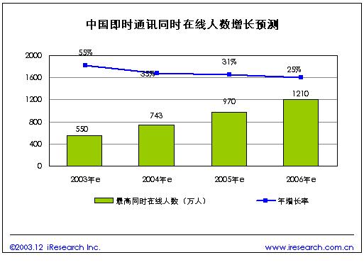 我們預(yù)計(jì)未來隨著中國(guó)上網(wǎng)人口的增長(zhǎng),以及IM軟件的不斷普及,即時(shí)通訊在線人數(shù)將保持快速增長(zhǎng)。預(yù)計(jì)2004年國(guó)內(nèi)IM最高同時(shí)在線人數(shù)有望突破740萬人,到2006年將突破1200萬人同時(shí)在線。