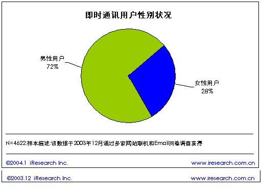 根據(jù)艾瑞市場(chǎng)咨詢(iResearch)的《2003年中國(guó)即時(shí)通訊研究報(bào)告》研究結(jié)果表明,在中國(guó)的即時(shí)通訊用戶中,72%的即時(shí)通訊用戶為男性,占據(jù)了大部分份額。女性用戶僅僅占28%?磥砟行跃W(wǎng)民更喜歡在網(wǎng)上聊天。