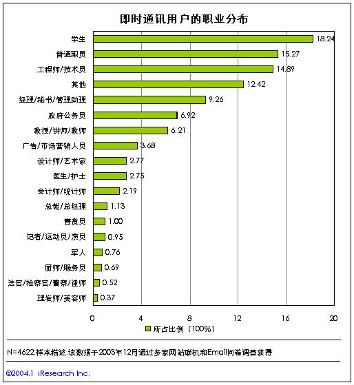 從即時(shí)通訊用戶的職業(yè)結(jié)構(gòu)來看,在中國(guó)的即時(shí)通訊用戶中,學(xué)生、普通公司職員、工程技術(shù)人員構(gòu)成了最主要的用戶群體,其中學(xué)生的比例最高,達(dá)到了18.24%?撮_學(xué)生是中國(guó)即時(shí)通訊的生力軍。