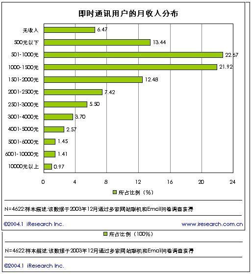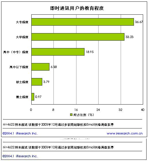 從即時(shí)通訊用戶的學(xué)歷水平來分析,在目前的即時(shí)通訊用戶中,大專以上教育程度的用戶比例達(dá)到了75%,占據(jù)了絕對(duì)高的比例。顯示出即時(shí)通訊用戶的整體教育水平非常高。