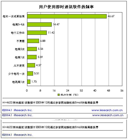 即時(shí)通訊所擁有的實(shí)時(shí)性、跨平臺(tái)性、成本低、效率高等諸多優(yōu)勢(shì),使之成為網(wǎng)民們最喜愛的網(wǎng)絡(luò)溝通方式之一。從用戶使用即時(shí)通訊軟件的頻率來看,是比較高的。根據(jù)我們的調(diào)研結(jié)果,58%的用戶至少每天使用一次即時(shí)通訊軟件,使用頻率在每周一次以下的用戶比例僅為15%。