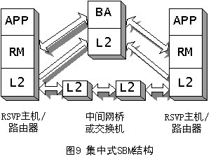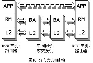 SBM有兩種形式的體系結(jié)構(gòu):集中式結(jié)構(gòu)和分布式結(jié)構(gòu),它取決于BA所處的位置,如圖9和圖10所示。不管在哪種形式的結(jié)構(gòu)中,RM都必須在需要請(qǐng)求資源的端系統(tǒng)中。APP表示需要使用RM的應(yīng)用,它可以是用戶應(yīng)用程序,也可以是高層協(xié)議(如RSVP)。