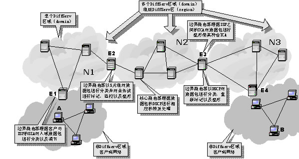DiffServ區(qū)(region)則是由連續(xù)的DS區(qū)域構(gòu)成。一個(gè)DS區(qū)內(nèi)的DS區(qū)域可以支持不同的PHB組,并且各自區(qū)域的DSCP到PHB的映射函數(shù)也可能不相同。在不同的DS區(qū)域之間,必須對(duì)SLA和TCA進(jìn)行調(diào)節(jié),以協(xié)調(diào)彼此之間的服務(wù)語義。這樣,通過在上游DS區(qū)域和下游DS區(qū)域之間建立SLA或TCA,區(qū)分服務(wù)可以擴(kuò)展到多個(gè)DS區(qū)域。