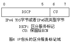 DS標(biāo)記域定義為IPv4頭部的TOS(Type of Service)字節(jié)或IPv6頭部的流類型(Traffic Class)字節(jié)。如圖4所示。其中DSCP(6bit)即為區(qū)分服務(wù)標(biāo)記,CU(2bit)在本體系中沒有使用,IETF已將它定義為ECN(Explicit