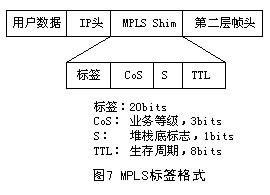 標(biāo)簽的格式取決于分組封裝所在的介質(zhì)。例如,ATM封裝的分組(信元)采用VPI和/或VCI數(shù)值作為標(biāo)簽,而幀中繼PDU采用DLCI作為標(biāo)簽。對(duì)于那些沒有內(nèi)在標(biāo)簽結(jié)構(gòu)的介質(zhì)封裝,則采用一個(gè)特殊的數(shù)值填充。圖7給出4字節(jié)填充標(biāo)簽的格式,它包含一個(gè)20bits的標(biāo)簽值、一個(gè)3bits的CoS值、一個(gè)1bit的堆棧標(biāo)識(shí)符和一個(gè)8bits的TTL值。此外.如果填充值被插入到一個(gè)PPP或以太網(wǎng)幀中,包含在各幀頭中的一個(gè)協(xié)議ID(或以太網(wǎng)類型)表示一個(gè)幀或者一個(gè)