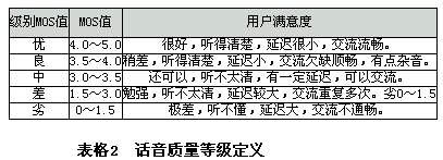 對(duì)于IP電話質(zhì)量的評(píng)價(jià)采用MOS(主觀平均評(píng)分)值評(píng)價(jià),評(píng)測(cè)方法在ITU-TP.800中定義。實(shí)際中可以采用PESQ(語(yǔ)音質(zhì)量的知覺評(píng)估)客觀測(cè)試方法,在ITU-TP.862(PESQ)中定義。MOS值的定義如下表所示: