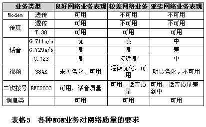 經(jīng)過試驗(yàn)測(cè)試,對(duì)不同網(wǎng)絡(luò)質(zhì)量下的NGN業(yè)務(wù)表現(xiàn)總結(jié)如下表所示: