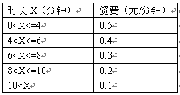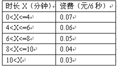 例3,國內(nèi)長途話費在時長不超過4分鐘的情況下,按0.07元/6秒收取;超過4分鐘但不超過6分鐘,統(tǒng)一按0.06元/6秒收;超過6分鐘但不超過8分鐘,統(tǒng)一按0.05元/6秒收;超過8分鐘但不超過10分鐘,統(tǒng)一按0.04元/6秒收;超過10分鐘,統(tǒng)一按0.03元/6秒收取。