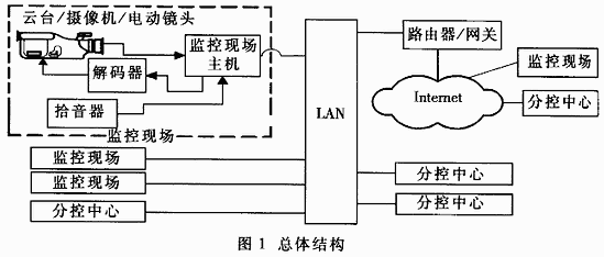 遠程監(jiān)控系統(tǒng)一般包括三部分:前端監(jiān)控現(xiàn)場、通信設備和后端分控中心。整個系統(tǒng)基于Client/Server(客戶機/服務器)模式?傮w結(jié)構(gòu)如圖1所示。