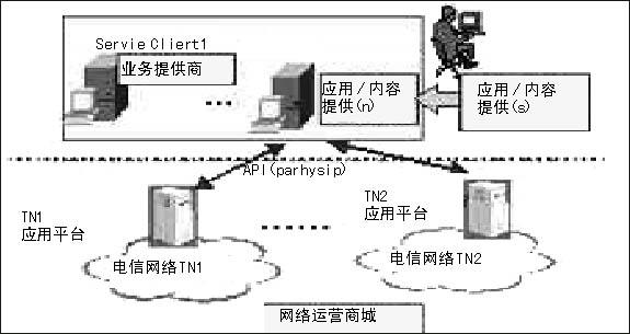 這種模式是指應(yīng)用服務(wù)器的兩部分應(yīng)用平臺和業(yè)務(wù)提供分別由傳統(tǒng)電信運營商和AP控制。應(yīng)用平臺在運營商域內(nèi)由運營商進行控制,而AP或者CP(Content provider)可以與傳統(tǒng)電信運營商簽約來提供業(yè)務(wù),業(yè)務(wù)與應(yīng)用提供通過開放的API由第三方提供。