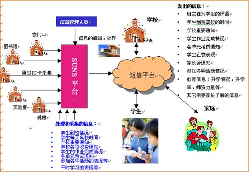從上圖可以看到,在建立了SUNS校園綜合管理短信平臺以后,學(xué)生在校的活動可以通過信息采集系統(tǒng)收集,在進行后臺信息處理的同時,建立一個與學(xué)生家庭直接溝通渠道。