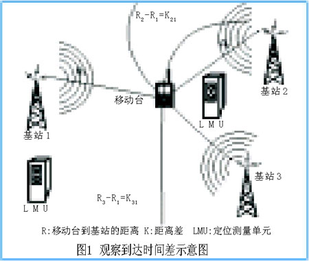 觀察到達時間差(OTDOA)是通過測量電波從發(fā)射機傳播到多個接收機的傳播時間差來確定目標移動臺的位置。初步測量通過UE接收的下行鏈路公共導(dǎo)頻信道的到達時間差實現(xiàn)。3個基站形成的平面上,一點到兩個固定點的距離差如為定值時,該點必定在一條雙曲線上,兩條這樣的雙曲線的交點便可得到移動臺的位置,如圖1