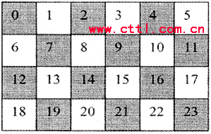 如圖3所示,陰影部分宏塊屬于片組0,白色部分屬于片組1。假設(shè)片組O在傳輸過程中丟失,由于丟失宏塊的相鄰宏塊都屬于片組1,這樣差錯恢復(fù)工具就會有更多的可利用信息來恢復(fù)丟失片的數(shù)據(jù)。