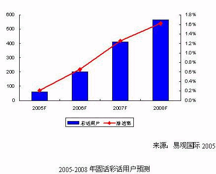 《固網(wǎng)增值業(yè)務研究系列報告-彩鈴彩話2005》中易觀國際認為,固話彩話業(yè)務將難以像小靈通彩鈴那樣得到廣泛的應用,但是能夠在細分市場中滿足固話用戶的個性化需求。易觀國際預測,2005年國內固話彩話用戶總數(shù)將達到60萬戶,市場規(guī)模為1,000萬元人民幣;到2008年,固話彩話用戶超過550萬戶,市場規(guī)模將超過1.7億元人民幣。