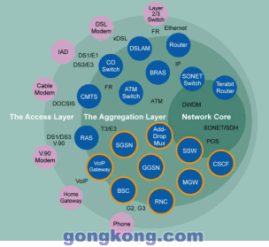 ATCA正在被廣泛應用于無線網,見圖2中橙色園環(huán)部分,這是由市場對成本效益,快速部署方案的需求驅動的。服務提供商和TEM均認識到:用戶愿意為3G網絡的先進功能所付出的只能是少量的附加費,因此從2G/2.5G向3G轉換必須以盡可能低的成本和盡可能靈活的方案來實施,許多TEM已經將ATCA看成滿足快速發(fā)展的無線市場需求的唯一技術。若基于雙星千兆以太網交換互連,ATCA的性能已經很好的滿足無線網要求,因為這些網絡實質上是低帶寬而高運算密度的網絡,對于實時敏感的語音應用而言,千兆以太網的高速度已經消除了延遲的問題。