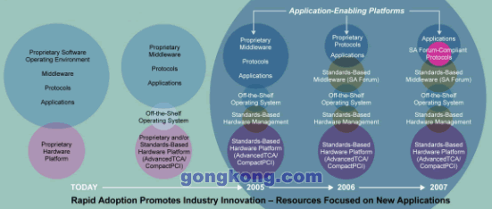 現在,許多TEM認識到他們可以通過預集成并驗證的面向應用平臺來極大地加速其開發(fā)周期,這一模式也加快了產業(yè)向標準演進的速度,全標準平臺可能將提前5年于2007年到來,如圖6所示。