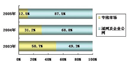 2004年,基于專線網(wǎng)絡(luò)的視頻會議系統(tǒng)與基于混網(wǎng)和企業(yè)公網(wǎng)的產(chǎn)品比例發(fā)生了轉(zhuǎn)折性變化,基于混網(wǎng)和企業(yè)公網(wǎng)的產(chǎn)品占到了68.8%的比例,成為了市場主流。計(jì)世資訊(CCW Research)研究表明:2005年,這一趨勢更趨明顯,基于混網(wǎng)和企業(yè)公網(wǎng)產(chǎn)品的比例將高達(dá)87.5%。
