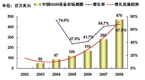 對于中國NGN市場規(guī)模的預(yù)測,主要取決于各個運(yùn)營商在NGN方面的戰(zhàn)略發(fā)展重點(diǎn),以及重點(diǎn)的投資方向。總體上來說,從2003年起,以IPTV、VOIP、寬帶接入等業(yè)務(wù)為代表的NGN的部分業(yè)務(wù)的推廣,使得事實上中國已經(jīng)形成一定的NGN的市場規(guī)模,盡管這一市場規(guī)模仍然很小。2004年中國的NGN基礎(chǔ)設(shè)備的市場規(guī)模超過8千萬美元,以后隨著各個運(yùn)營商N(yùn)GN戰(zhàn)略的進(jìn)一步清晰,這一部分的投資會保持持續(xù)穩(wěn)定的增長,2005~2008年以后的NGN設(shè)備投資規(guī)模的平均增長率可以達(dá)到50%。