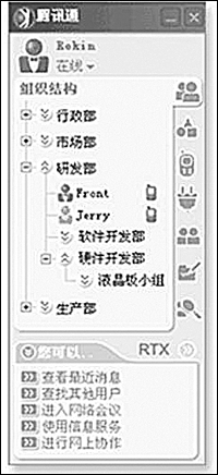 與其他應(yīng)用程序集成是EIM的發(fā)展趨勢,也是企業(yè)現(xiàn)代辦公的一大需求。目前,騰訊通RTX已成功與國內(nèi)著名的金碟、用友、北京慧點等軟件廠商開展合作,使騰訊通RTX的整體功能進(jìn)一步提升,極大地方便了企業(yè)應(yīng)用。比如通過與金碟OA的集成,實現(xiàn)了企業(yè)級實時通信平臺與企業(yè)管理軟件和信息化解決方案的緊密結(jié)合,從而更好地滿足客戶需求。通過與用友ERP集成,降低了企業(yè)通信時間和費用,提高了工作效率。