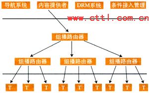 IPTV業(yè)務(wù)提供者可以根據(jù)用戶的請求,利用IP網(wǎng)絡(luò)本身所提供的組播能力將視頻信息以組播的方式傳送給用戶。此時,同時向相同的業(yè)務(wù)提供者請求發(fā)送相同內(nèi)容信息的用戶,可以由業(yè)務(wù)提供者安排在同一個組播組中接收到相同的信息。為給內(nèi)容提供者提供知識產(chǎn)權(quán)保護(hù),業(yè)務(wù)提供者提供條件接入控制。同時為減少骨干網(wǎng)絡(luò)傳輸?shù)膲毫,業(yè)務(wù)提供者在向眾多的用戶提供組播式業(yè)務(wù)時可以利用多級組播的形式來實現(xiàn)。組播式IPTV業(yè)務(wù)可能的系統(tǒng)模型示意如圖1所示。