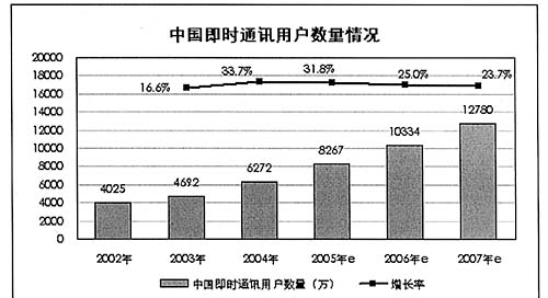 圖為:02年-07年中國(guó)即時(shí)通訊用戶數(shù)量及增長(zhǎng)率 來(lái)源:艾瑞咨詢(xún)