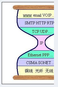 RFC1958和RFC3724等所描述的“端到端的透明性”是Internet一直堅(jiān)持的為數(shù)不多的Internet體系架構(gòu)的核心設(shè)計(jì)理念。所謂端到端的透明性,就是在TCP/IP的設(shè)計(jì)中,將Internet系統(tǒng)中與通信相關(guān)的部分(IP網(wǎng)絡(luò))與高層應(yīng)用(端點(diǎn))分離,最大限度地簡化網(wǎng)絡(luò)的設(shè)計(jì)。在有些文獻(xiàn)中也稱其為“沙漏”模型,如圖1。