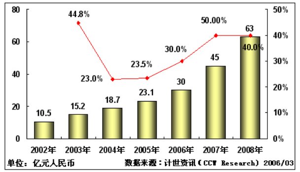 計世資訊(CCW Research)預(yù)測認為,2006年和2007年視頻會議市場將以30%和50%的增長率飛速增長。市場規(guī)模分別達到30億和45億人民幣。而2008年隨著奧運建設(shè)的告一段落,整個市場將進入一個消化調(diào)整期,市場發(fā)展速度則逐步開始放慢。