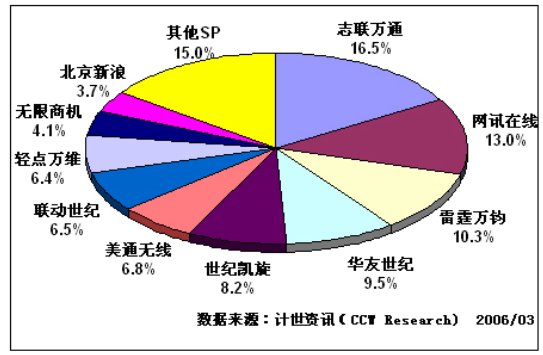 計世資訊(CCW Research)數(shù)據(jù)顯示:從各SP的收入構(gòu)成來看,IVR業(yè)務(wù)的市場集中度非常高。以中國聯(lián)通為例,收入前10位的SP有:志聯(lián)萬通、網(wǎng)訊在線、雷霆萬鈞、華友世紀(jì)、世紀(jì)凱旋、美通無線、聯(lián)動世紀(jì)、輕點萬維、無限商機、北京新浪,他們的總收入占到聯(lián)通全部IVR業(yè)務(wù)收入的85%。