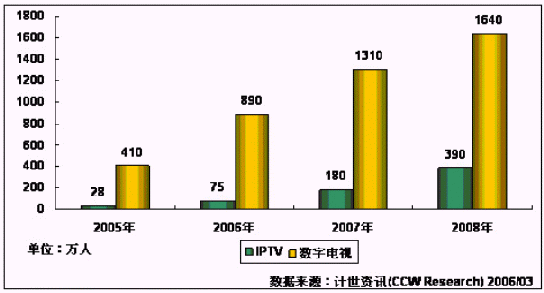 當然,從國際上看,電信和廣電的融合是主流趨勢,但從目前國內(nèi)的情況來看,由于牽扯到利益沖突,融合并非一句話的事,仍需要克服重重阻力。計世資訊(CCW Research)的數(shù)據(jù)顯示,在2005年IPTV的用戶只有僅僅28萬人,而廣電數(shù)字電視用戶已經(jīng)達到410萬人。相信在未來幾年內(nèi)這個比例很難有大的變動。IPTV要想趕超數(shù)字電視還需要付出更大的努力。