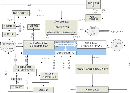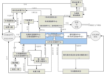 指政府決策指揮中心、先期指揮中心、便民服務(wù)中心、公共安全監(jiān)控中心,通常還有移動指揮中心和災(zāi)備中心,以及其它節(jié)點的建設(shè)。一般地,先期指揮中心與便民服務(wù)中心可互為備份。政府決策指揮中心對重大、特別重大突發(fā)公共事件進行協(xié)調(diào)、決策,偏重于自然災(zāi)害與生產(chǎn)安全方面,而一般、較重突發(fā)公共事件仍保持由各專業(yè)指揮部指揮、處置,只有當(dāng)跨區(qū)、跨機構(gòu)需要協(xié)調(diào)時由政府決策指揮中心進行協(xié)調(diào)。