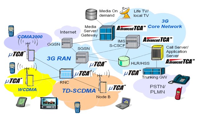3G網(wǎng)絡(luò)中占主要地位的三個無線接入標(biāo)準(zhǔn)是WCDMA、TD-SCDMA與CDMA2000。3GPP與業(yè)界廠商對網(wǎng)絡(luò)結(jié)構(gòu)的標(biāo)準(zhǔn)化做出的杰出努力,為在世界范圍內(nèi)成功布署3G網(wǎng)絡(luò)業(yè)務(wù)起到了至關(guān)重要的作用。不過,3G網(wǎng)絡(luò)是復(fù)雜的系統(tǒng),包含有多種多樣的網(wǎng)元設(shè)備,AdvancedTCA與MicroTCA技術(shù)的出現(xiàn)把它的實(shí)現(xiàn)方式引向了標(biāo)準(zhǔn)化的道路,即通過商用組件快速、低成本地布署3G網(wǎng)絡(luò),減少了各種獨(dú)立的實(shí)現(xiàn)方式的復(fù)雜性,提高了互操作性。