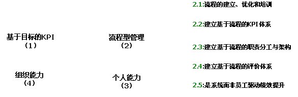 因此,要有效實(shí)施“流程型”管理,必須在我們?nèi)粘9芾淼膬?nèi)容、KPI體系、組織架構(gòu)、績(jī)效評(píng)價(jià)體系和組織發(fā)展的驅(qū)動(dòng)力五個(gè)方法實(shí)施同步的轉(zhuǎn)變,才能有效建立流程文化,保證整個(gè)組織對(duì)流程的理解和重視,提高組織的執(zhí)行能力,通過(guò)“組織能力”保證組織目標(biāo)的實(shí)現(xiàn),而非依賴個(gè)體能力。