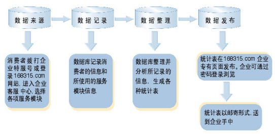 "企業(yè)客戶服務系統(tǒng)"統(tǒng)計數(shù)據(jù)分析功能,能幫助企業(yè)管理人員適時監(jiān)控"企業(yè)客戶服務系統(tǒng)"的運行情況,自動采集消費者在使用"企業(yè)客戶服務系統(tǒng)"過程的相關數(shù)據(jù),并分類整理成數(shù)據(jù)庫,為企業(yè)經(jīng)理人投資決策提供重要的數(shù)據(jù)支持。企業(yè)經(jīng)理人只需登陸客戶服務網(wǎng)站www.168315.com,按照"168315客戶服務中心"提供的用戶名和密碼登錄,即可隨時下載"企業(yè)客戶服務系統(tǒng)"的運行數(shù)據(jù),瀏覽客戶檔案庫。也可以由"中心"的服務人員將統(tǒng)計結果通過E-mail、傳真或郵寄的方式送到企業(yè)經(jīng)理人手中,如下圖: