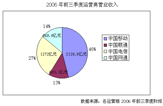 近日,四大運(yùn)營(yíng)商紛紛公布2006年前三季度的財(cái)務(wù)報(bào)表,截止9月底中國(guó)移動(dòng)營(yíng)運(yùn)收入達(dá)到2126.91億元,比上年同期增長(zhǎng)20.8%,遠(yuǎn)遠(yuǎn)高于競(jìng)爭(zhēng)對(duì)手中國(guó)聯(lián)通的營(yíng)業(yè)收入增長(zhǎng)5.6%,而固網(wǎng)運(yùn)營(yíng)商中國(guó)電信和中國(guó)網(wǎng)通的收入增長(zhǎng)更低,僅為4.5%和2.03%。透過這些數(shù)字,我們看到的是運(yùn)營(yíng)商實(shí)力差距的進(jìn)一步拉大。