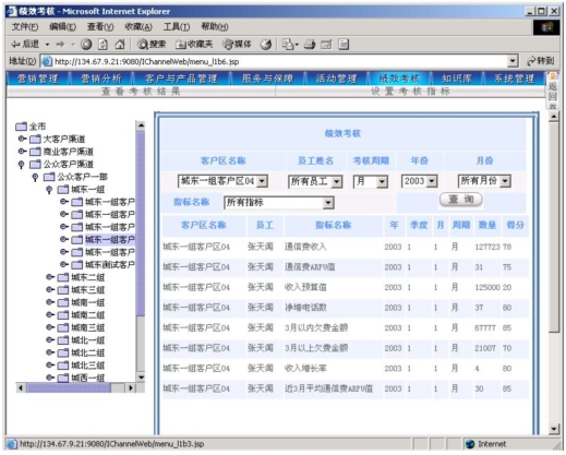 作為電信營銷服務支撐系統(tǒng),其主要功能是支撐營銷人員開展營銷活動,并通過功能完善的考核系統(tǒng)幫助各級人員進行工作管理。本系統(tǒng)可以對KPI指標進行靈活的設定,可以靈活定義多種參與考核的數(shù)據(jù)來源,使得各級主管能夠?qū)蛻艚M、社區(qū)(商業(yè)客戶區(qū)、農(nóng)村統(tǒng)包區(qū))的營銷服務工作進行考核評分。考核周期可以通過參數(shù)進行設定(一般以月為單位)。