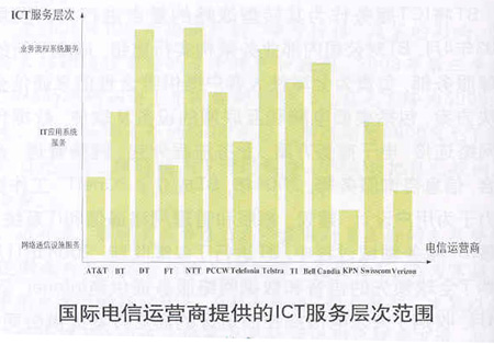 ICT服務(wù)的范圍大致可分為三個(gè)層次,一是面向網(wǎng)絡(luò)通信設(shè)施(包括網(wǎng)絡(luò)規(guī)劃、網(wǎng)絡(luò)系統(tǒng)集成、外包管理等)的服務(wù),二是面向IT應(yīng)用系統(tǒng)(包括軟件系統(tǒng)支持與維護(hù)、系統(tǒng)集成、應(yīng)用托管等)的服務(wù),三是面向業(yè)務(wù)流程系統(tǒng)(包括系統(tǒng)咨詢、業(yè)務(wù)流程外包等)的服務(wù)。從客戶視角來(lái)看,第三種服務(wù)的層次最高,第一種服務(wù)的層次最低,而電信運(yùn)營(yíng)商提供的ICT服務(wù)層次越高,則表明其在該領(lǐng)域拓展的范圍越廣。上述國(guó)際電信運(yùn)營(yíng)商提供的ICT服務(wù)層次范圍如下圖所示。