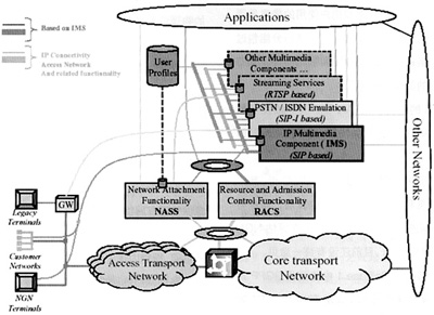 R6中的相關規(guī)范,但要求支持更多的接入方式,包括xDSL、WLAN、LAN、MAN等。此外,還定義了網絡附著子系統(tǒng)和資源準入控制子系統(tǒng)(RACS)。在這樣的框架下,NGN可以實現(xiàn)基于SIP的業(yè)務、基于SIP-I協(xié)議傳統(tǒng)業(yè)務以及基于RTSP的業(yè)務等。ETSI