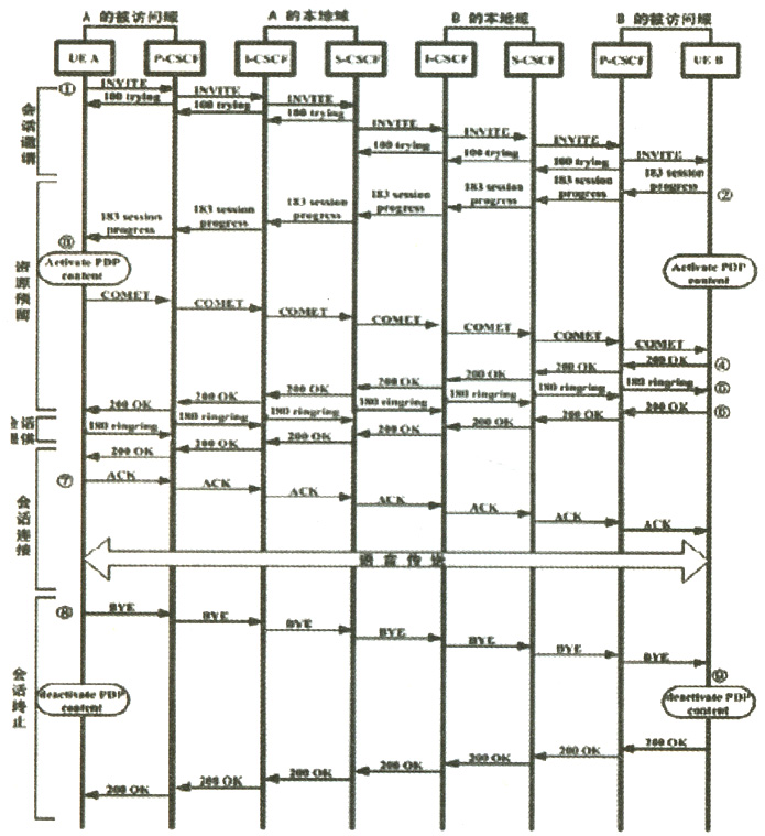 A收到183應(yīng)答后,同樣激活一個PDP上下文并通過CSCF建立的通道發(fā)送一個COMET消息給B,該消息含有A的語音通道的地址細節(jié),并起確認作用。