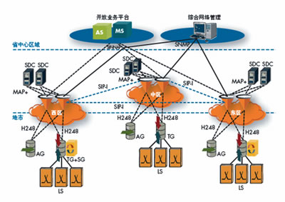 呼叫控制和信令層:三對(duì)軟交換被放置于省內(nèi)的三個(gè)區(qū)域,為網(wǎng)絡(luò)上的700多萬(wàn)用戶提供呼叫控制和信令交換。這三個(gè)分離的區(qū)域提供省內(nèi)范圍的話務(wù)以及容災(zāi)備份。雙歸屬機(jī)制被引入從而能夠在集中式的網(wǎng)絡(luò)拓?fù)渲斜U习踩透呖煽啃浴?br />